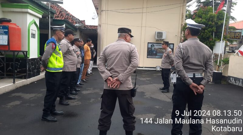 POLRESTA SERKOT_ Kanit Samapta Polsek Serang Polresta Serkot Iptu Rudi pimpin pelaksanaan apel siaga Idul Adha 1445H di halaman Polsek Serang Jalan Maulana Hasanudin No 166 Kota Serang, Senin (09/07).